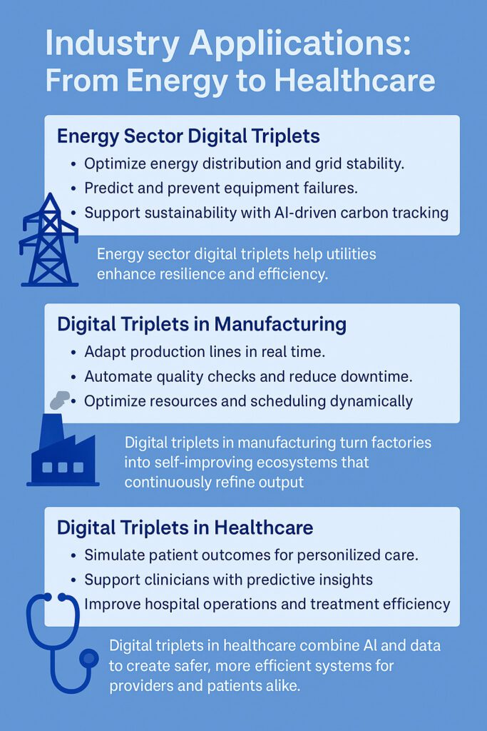 The infographic below highlights how digital triplets are already transforming industries, from energy and manufacturing to healthcare, by enhancing intelligence, reliability, and performance.