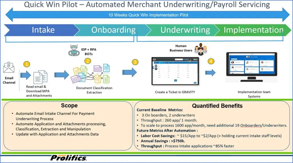 This US-based fintech company offers payment processing and point-of-sale (POS) solutions, payroll, insurance coverage, gift and reward cards, and other financial tools for small businesses. This success story falls under Prolifics’ Intelligent Process Innovation and Digital Automation & AI offerings. We acquired this client through our Intelligent Automation Workshop.