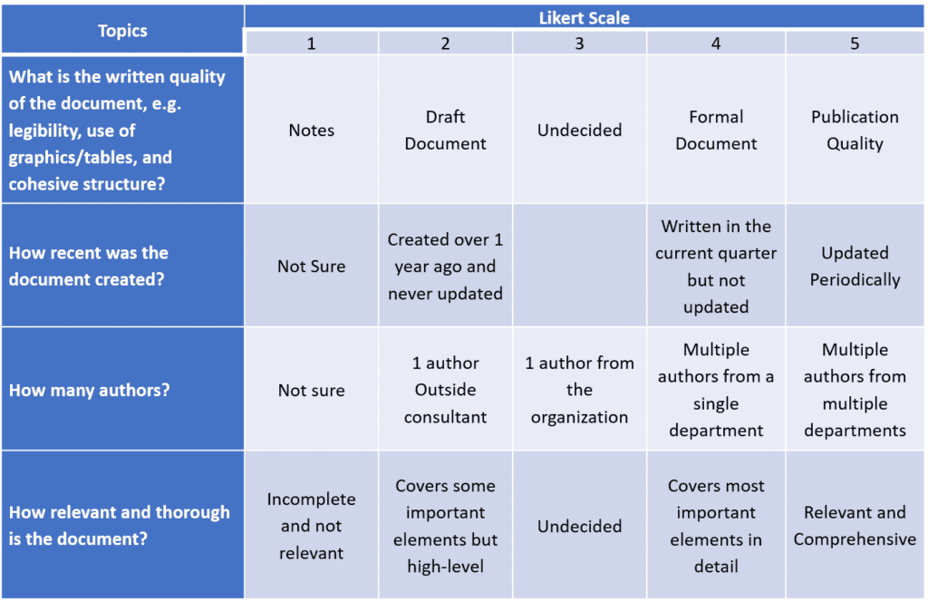 A reasonable approach for examining antecedent documents is for the assessment team to review and comment on each document. However, this process is definitely a “black box” that is difficult to repeat. There are, however, elements of the antecedent evaluation that can be evaluated in a methodical, repeatable manner. Assessment members can leverage a Likert Scale and answer specific questions relating to each document such as those outlined in Table 2.