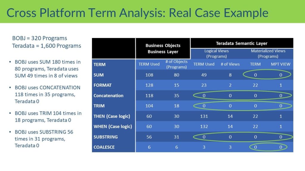 As Dr G. explains, you can’t read all the lines of code to see where the “heavy lifting” is – it’s impossible because of sheer scale and knowledge needed for different platforms. “Instead, our process works because it uses data science and text mining to consume thousands of programs and analyze the word usage in the language (SQL or any language). I’ve developed a dictionary for very specific words that I know characteristically are ‘resource pigs.’ These words demonstrate a lack of proper planning – they just consume a ton of resources on one platform versus the optimal use of both platforms.”